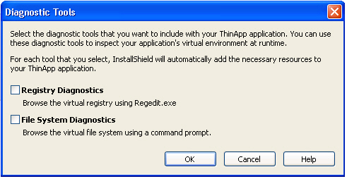 4. If you want to include the Windows Command Prompt application with your ThinApp application so that you can browse the virtual file system at runtime from within the virtual environment, select the File System Diagnostics option.