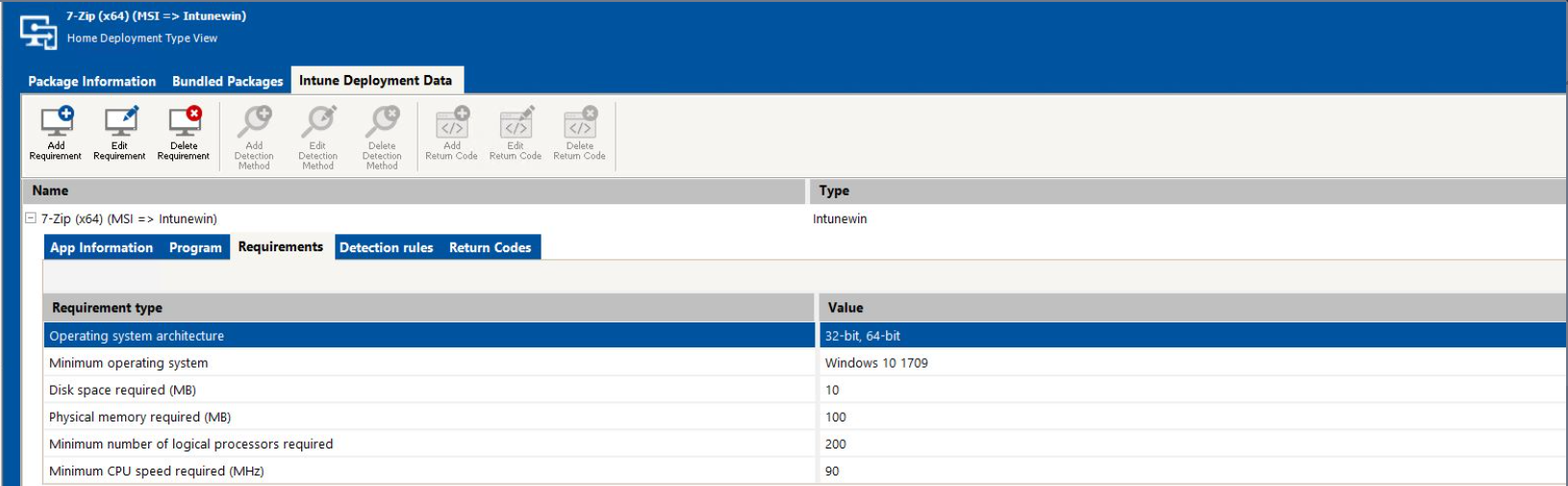 You can use the Requirements subtab of the Intune Deployment Data tab to add device, or additional requirements that the target system needs to successfully deploy this package.