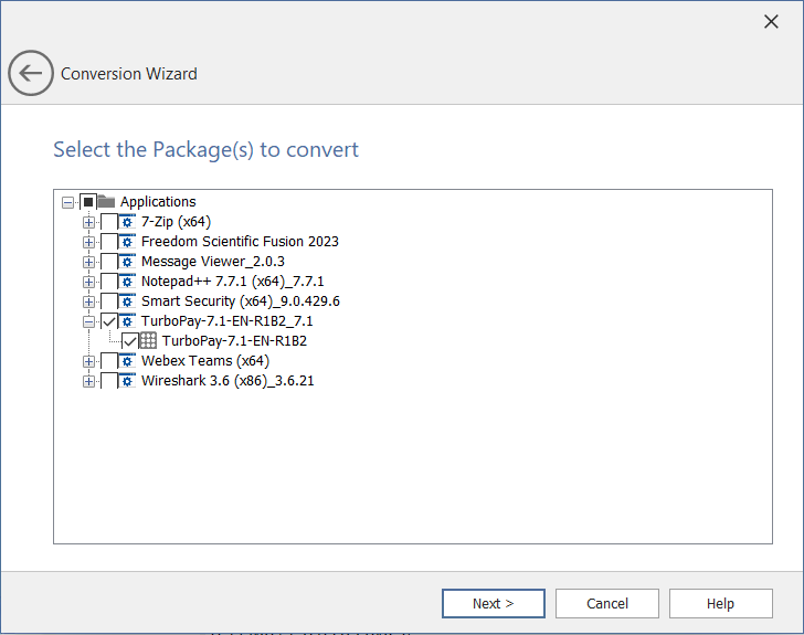- In the Select the Package(s) to convert panel, select the App-V packages or packages that you had selected when you invoked the Conversion Wizard are selected. Select additional packages, if desired, and click Next. The Package Output Location panel opens.