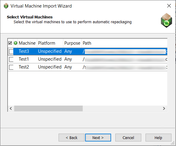 On the Select Virtual Machines panel, select the virtual machine images that you want to use to perform automated repackaging.
