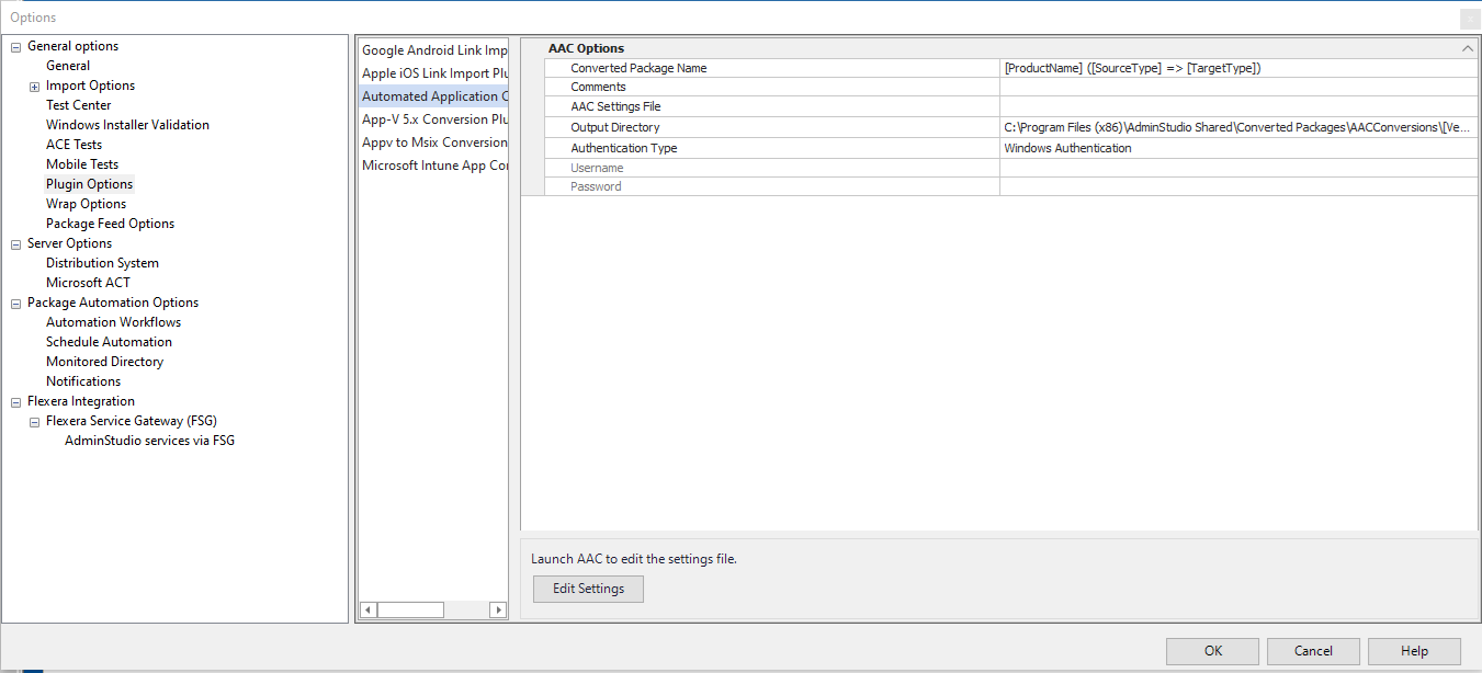 - In the AAC Settings File field, browse to the Automated Application Converter settings file you created in Creating an Automated Application Converter Settings File.