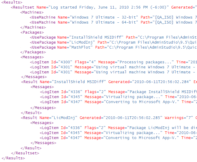 | Results | The <Results> element contains multiple <Resultset> elements, each of which contains information on a conversion run:![]() Each <Resultset> element of a <Results> element includes information on <Machines>, <Packages>, <Messages>, and multiple <Result> elements for that run. Each <Result> element of a <Resultset> element contains information on the conversion run for an individual package. |