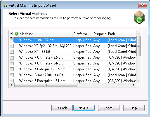 By default, virtual machines that you add to the Machines tab will be available for use for both automated repackaging of packages and for testing packages. However, if you want to specify that a virtual machine should be used for only repackaging or for only testing, click in the Purpose column of that virtual machine and select one of the following options: